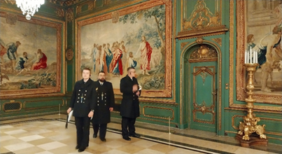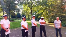 Klaus Jakobi pfeift mit der Bootsmannpfeife zur Ehrung der